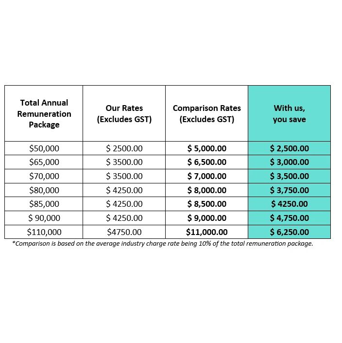 Affordable Recruitment Services Pty Ltd rates are calculated on the total annual remuneration package (includes superannuation, bonuses, allowances), with 5 rate ranges available. See comparison chart below to see how much you can save with us.